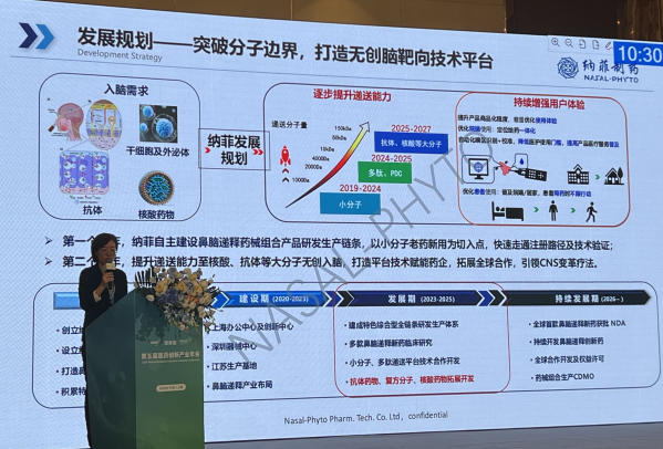會上劉靜怡博士介紹,鼻腦遞釋技術(shù)的核心優(yōu)勢,在于(一)顛覆性的遞送路徑:將直接繞過血腦屏障(BBB)、高靶向進入腦內(nèi)發(fā)揮作用;(二)顯著的臨床效益——快速起效、降低外周副作用以及無創(chuàng)且依從性高;(三)針對常規(guī)途徑難以入腦的大分子,例如核酸、抗體藥物、神經(jīng)干細胞等,該技術(shù)路徑可實現(xiàn)無創(chuàng)腦靶向遞送,為CNS疾病治療開啟新的時代。目前納菲已實現(xiàn)一系列突破性進展,首款抗腦血管意外代表性管線NPRD003已成功獲批FDA IND(Type 1 Drug-Device Combination),即將進入臨床階段;針對中樞病理性疼痛、精神分裂、阿爾茲海默癥等一系列CNS適應(yīng)癥,持續(xù)開發(fā)多條小分子、大分子管線;并且基于特色技術(shù)平臺,正開展廣泛的行業(yè)交流與合作。